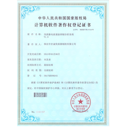 計(jì)算機(jī)軟件注冊(cè)權(quán)登記證書(shū)——變流器電流諧波抑制分析系統(tǒng)V1.0