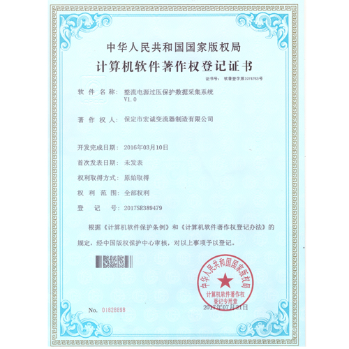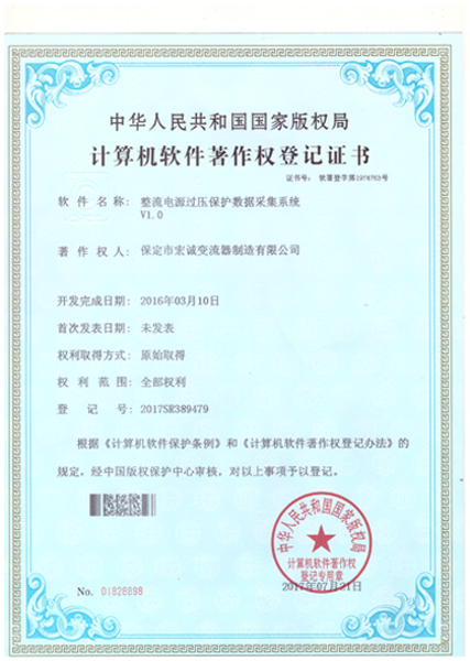 計(jì)算機(jī)軟件注冊(cè)權(quán)登記證書(shū)——整流電源過(guò)壓保護(hù)數(shù)據(jù)采集系統(tǒng)V1.0